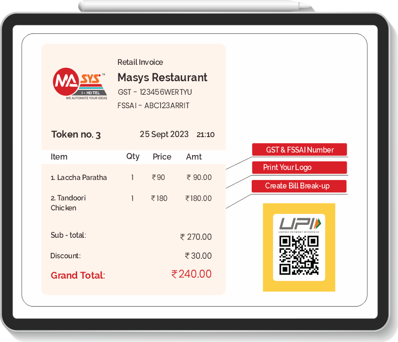 Print your restaurant logo, create bill break-ups, edit customer details or add a dynamic QR code for payments right at the billing counter - everything is possible with I-Hotel restaurant POS software