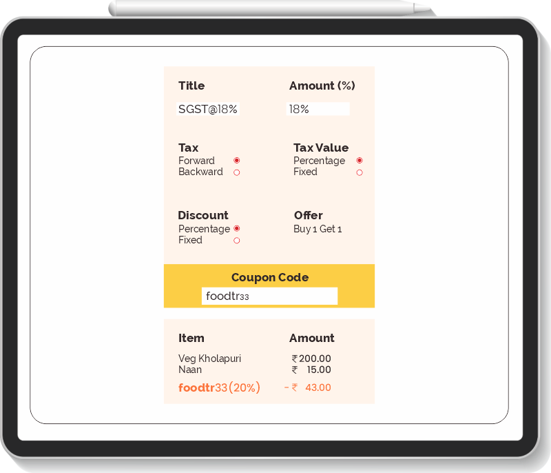 Switch to a restaurant billing software that lets you easily configure and levy different taxes, update tax rates and offer discounts depending on your service types, regional norms and business needs!