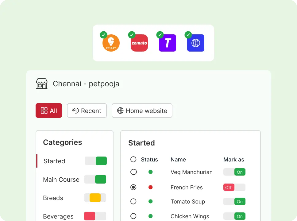 Make and modify the menu for your restaurant to suit your needs! Turn your online menu ON or OFF in accordance with stock levels.