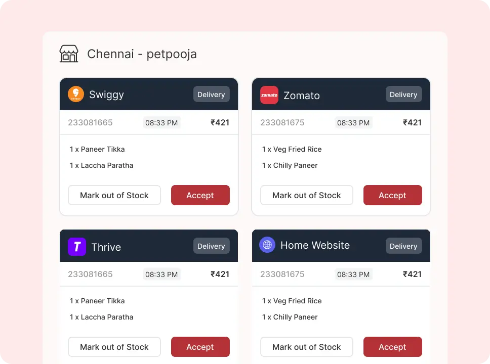 Order by the table or by the area, print the KOT, and take payment. From a single interface, handle all online orders, delivery, and other tasks.